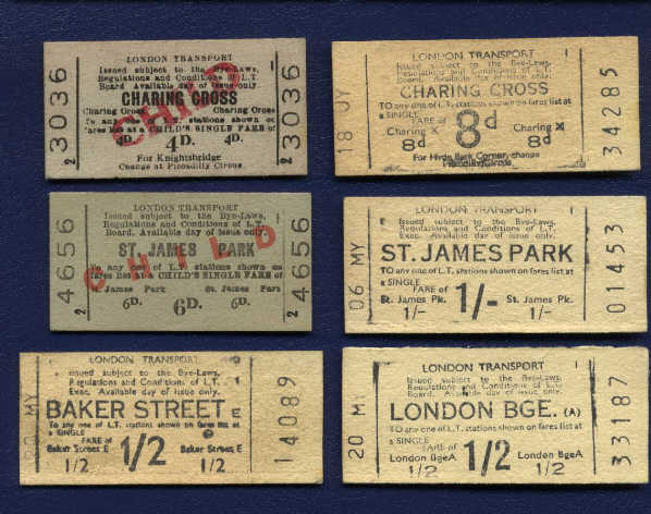 London Transport Underground tickets issued at various dates in 1965. The station name shown on the ticket is the starting station, not the destination. Travel was to any station shown in the fares list at the price on the ticket. |