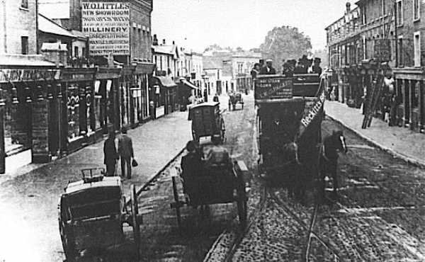A Croydon Horse Tram in London Road, Broad Green. c. 1890. The sign
