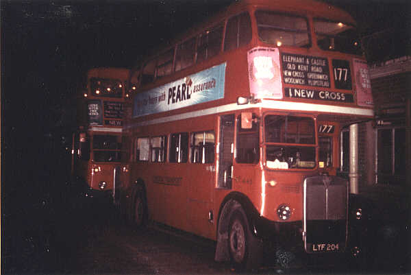 This is a bus from New Cross garage (NX). It is displaying an older style intermediate destination blind, with all upper case lettering. The destination New Cross shows that this bus was on its home run. The 177 was run by NX and AW garages. Photograph. John King |