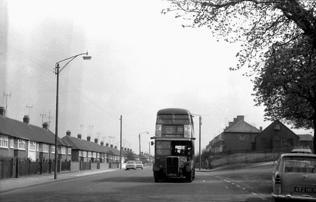 The trolleybus traction poles can still be seen although the lamps have been changed in this picture of April 1968. A pleasant looking place on a late spring day has become considerably run down in later days after 'improvements'. A flyover now passes above where the bus stop is standing with a car park underneath. See this scene in 2002 here. Photograph. John King. |