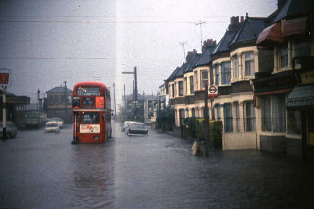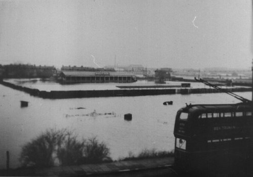The trolleybus is on route 698. Under several feet of water behind is Erith and Belvedere football ground. Now occupied by B&Q Belvedere. |