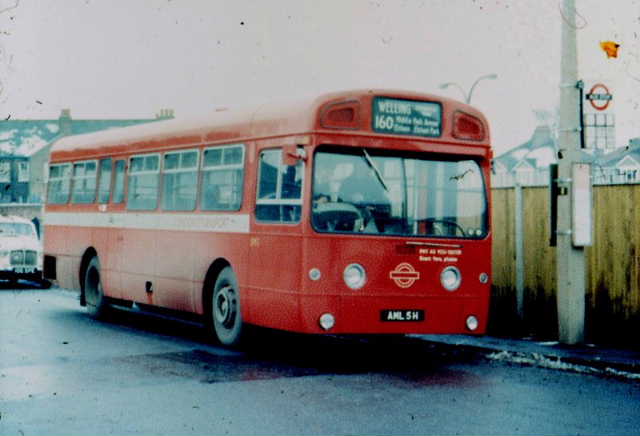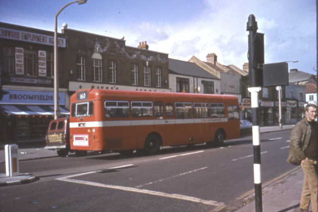 In 1970 route 160 ran from Catford to Welling, Nags Head, via Eltham Green, Middle Park, Eltham, Eltham Park, and Welling Way. Route 160 was converted to SM from RT on 24 January 1970, so this was an early photograph, possibly the first day. Photograph. John King. |
