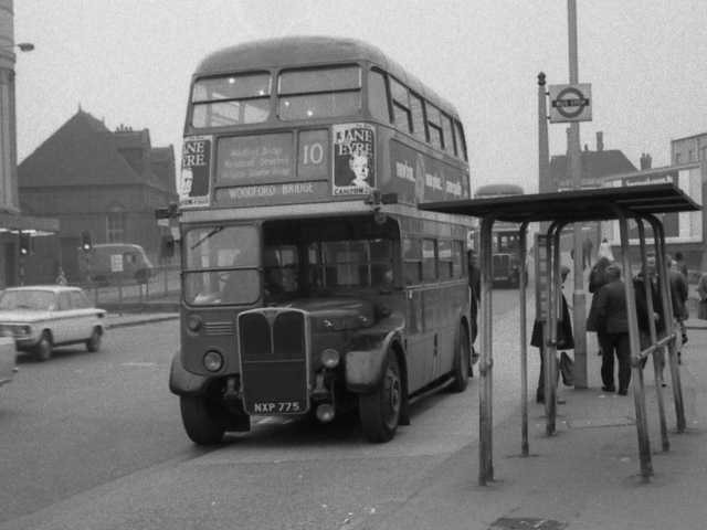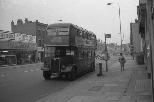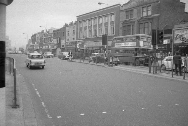 A view of Broadway, Stratford on 29 March 1971 with a line of RTs on