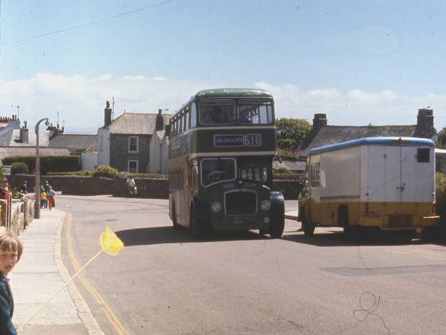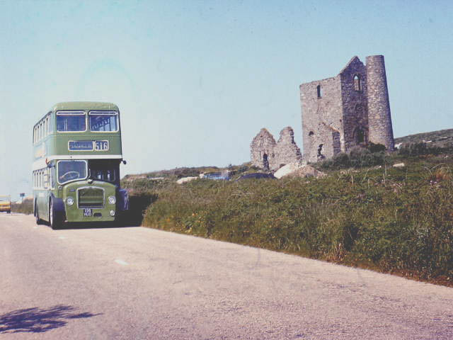 sevice 516 on the B3311 near Cripplease the road between St Ives and Penzance. Also in the picture an old enging winding house. June 1975.. Photograph. John King. |