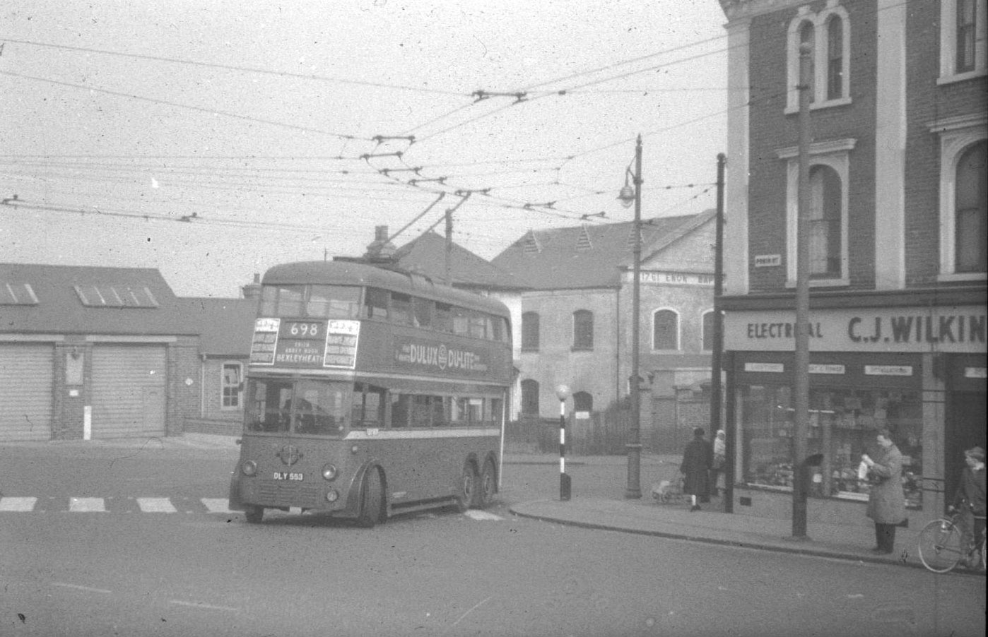 The pictures (DB403 DB402 CR185 and BXD) are of the purpose built trolleybus depot built for the new services which replaced the old 96 and 98 trams. the 96 tram went to Horns Cross on the far side of Dartford. Recently the 96 bus which replaced the 696 was extended to nearly this same place to cater for the new Bluewater shopping complex. The service on route 698 was introduced on 10 November 1935 and route 696 on 24 November 1935 Both routes were withdrawn on 3 March 1959. and replaced with motor buses. There were only three trolleybus reversers on the London system. Two of them in this little corner, one at Griffin Road, Plumstead, and the other at Princes Road, Crayford. The only other one was at Madaline Road, near Crystal Palace. (DB401) Is in Dartford High Street/Spital Street, and (DL1) is outside the Dartford library, on service 696. (DB404) shows Market Street Dartford, At one time the buses worked anti-clockwise around the terminus, but this was changed. Between Dartford and Bexleyheath stands the town of Crayford. (Dartford was on the Darenth and Crayford on the Cray). (DB409) is on the hill from Crayford to Bexleyheath, part of the Roman Road, Watling Street. (DB401) is in Walnut Tree Road outside the Erith council offices. at the bottom of this road on the other side is the old Erith Corporation Tramway depot, trams ran from here on part of the 698 route. In the background can be seen shipping on the Thames. This bus is showing Woolwich on the blind, but it is facing the wrong way. It may be ready to turn on a short working, but the tuning circle is at the bottom of this hill. The conductor may have just forgotten to alter the blind. Just around the corner is the Wheatley Hotel, a 698 can be seen outside (DB397). This was at one time a busy tramway crossover. The hotel is named after the Wheatley's, a local family, the road is Bexley Road. The Parish Church of Erith is over a mile from the town centre, as the town migrated its way from one end of West Street to the other in the 16th-17th century. West Street was a busy industrial area at the time (DB405) was taken. This is about halfway along the road. Just behind the bus an industrial line crossed the road on a leval crossing, which took ballast from a nearby sand quarry to the river front. There was another level crossing a short way off near Station Road Erith. (DB400, DB406, PH1) These pictures are at the Parsons Hill terminus, outside the Odeon Cinema, looking from this point now the new terminus for the Woolwich Free Ferry can be seen. In (DB398) The bus is just turning into the end of Powis Street, before turning into Parsons Hill. These shops have now been demolished, as has the Enon Chapel and other buildings. The building with the two shutters was the ambulance station. When the road was widened in the 60s for the new ferry approach this was left in the middle of the new roundabout until the new one adjacent to the ferry buildings was completed. There is still a pedestrian crossing at this point. Parsons Hill terminus opened on 14 July 1943. Previous to this the trolleybuses terminated at Woolwich Free Ferry. The buses turning circle was at Market Hill, Woolwich High Street outside the power station. (CR103). Up to this point prior to the withdrawal of the trams, trollybuses shared the positive wires of the tramway system. A new double set of wires had to be installed between Market Hill and Parsons Hill as Market Hill was the point where the tramway changed from overhead to the underground conduit system used in the central London area. (DB406) is at Plumstead Corner, the junction of Plumstead High Street with Wickham Lane. It is here that routes 696 and 698 diverged. The 698 went straight on to Belvedere, Erith and Bexleyheath, while the 696 turned into Wickham Lane to go to Welling and Bexleheath. The 696 then went onto Dartford. Behind the Trolley can be seen a 177 bus, This service replaced the trams on routes 36 and 38 in 1952. |